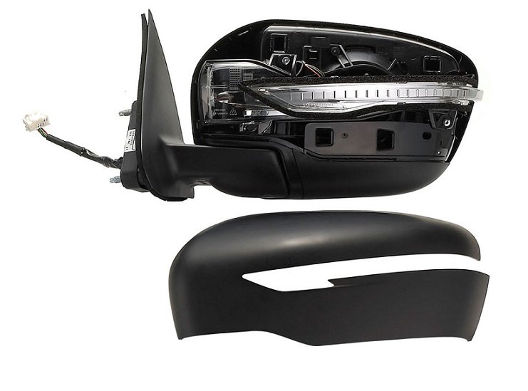 Complet, avec coque noire, feu clignotant et glace convexe. Réglage intérieur électrique, non dégivrant, rabattable manuellement avec connecteur 5 fiches.